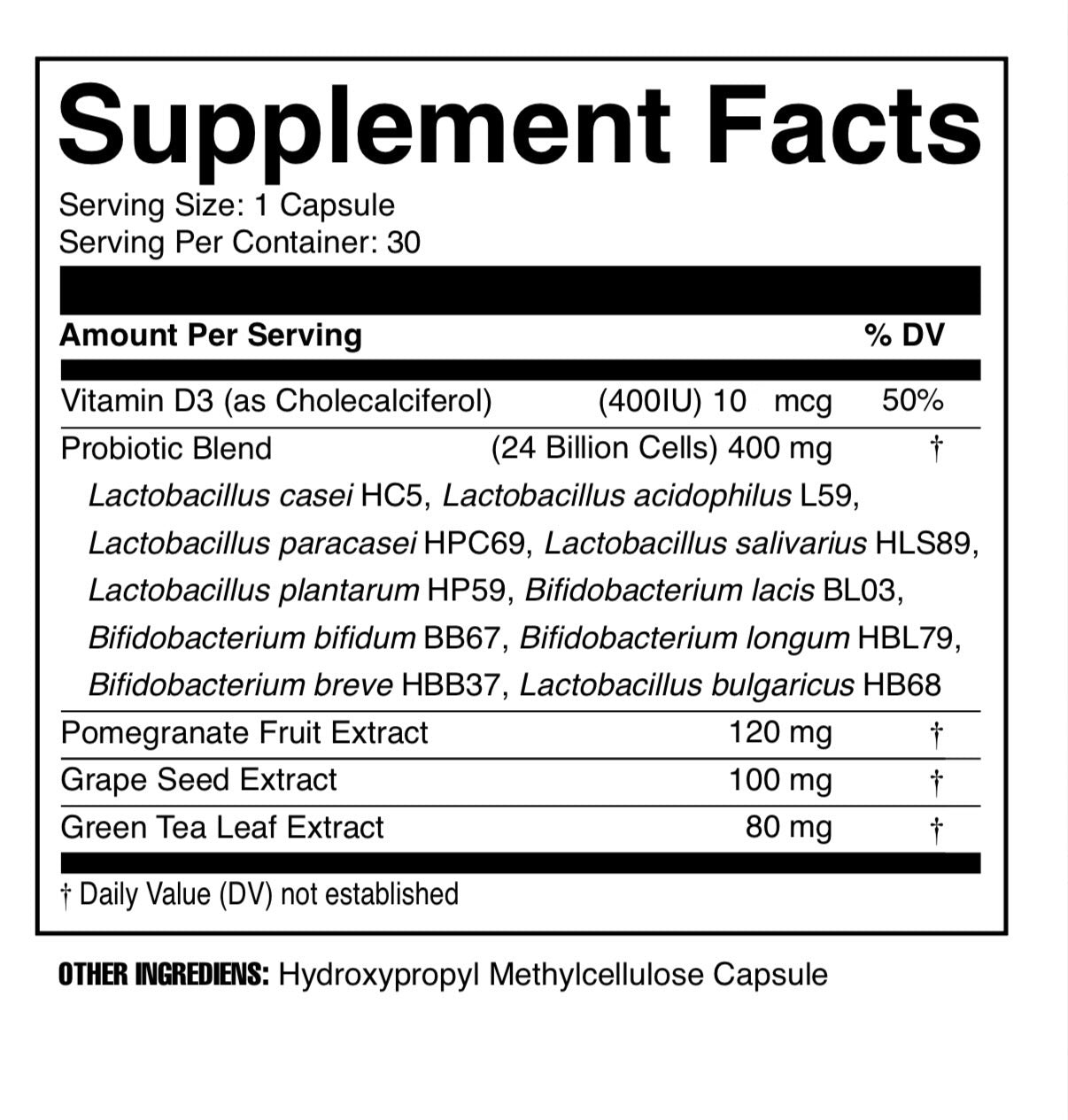 Vitamin D3 (Chloecalciferol), Probiotic Blend: Lactobacillus casei HC5, Lactobacillus acidophilus L59, Lactobacillus paracasei HPC69, Lactobacillus salivarius HLS89, Lactobacillus plantarum HP59, Bifi dobacterium lacis BL03, Bifi dobacterium bifidum BB67, Bifi dobacterium longum HBL79, Bifi dobacterium breve HBB37, Lactobacillus bulgaricus HB68, Pomegranate Fruit Extract, Grape Seed Extract, Green Tea Leaf Extract